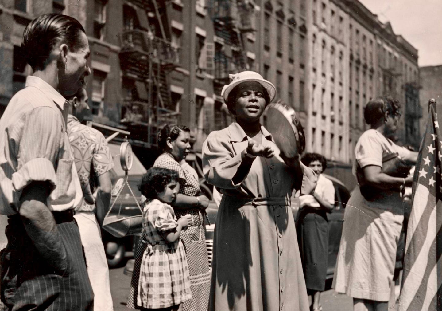 Above: detail of Crowded street scene with woman playing tambourine from the Schomburg Center for Research in Black Culture, Photographs and Prints Division, The New York Public Library. Used by permission.